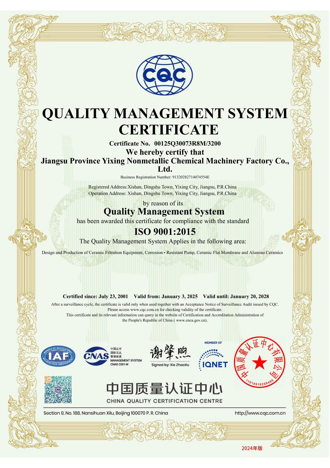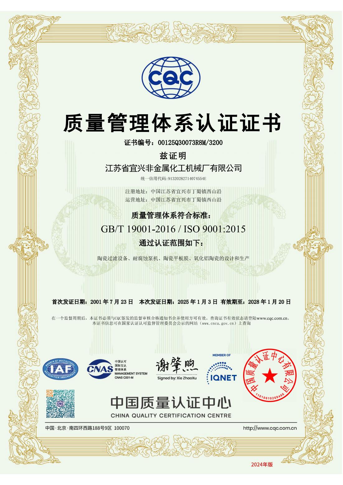 ISO9001质量管理体系认证证书-中文
